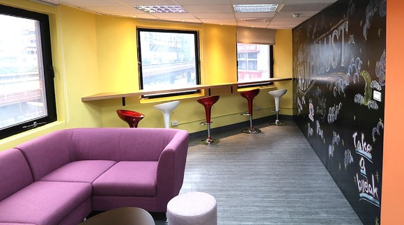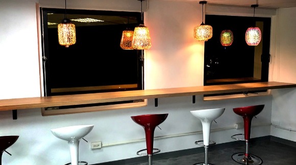 辦公室靠窗的一旁,運用昏黃的吊燈、臨窗的吧檯及高腳椅,打造員工休息、聊天的休閒空間。